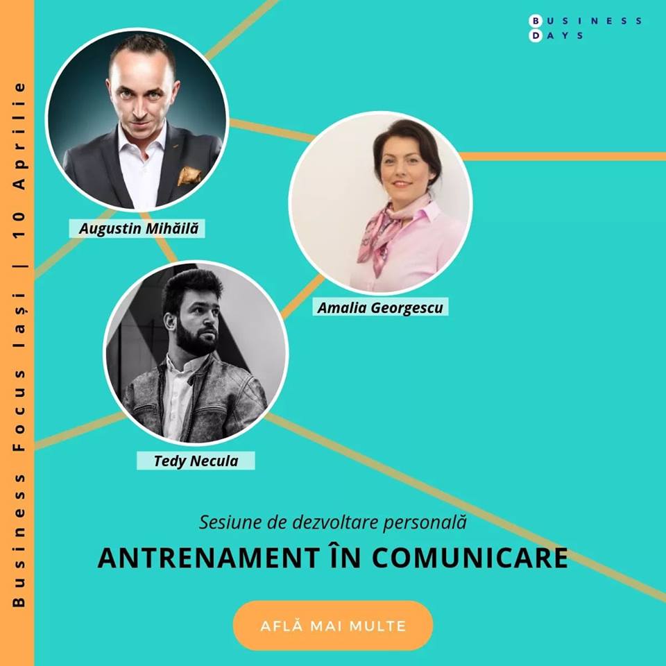 Amalia Georgescu, Owner AGEO Events, a fost speaker în cadrul Sesiunii speciale de antreprenoriat (Antrenament în comunicare), Sesiunii speciale nr. 2 (Produsul, piaţa şi poziţionarea) şi în cadrul Workshop-ului HR&Leadership (Comunicarea în leadership).