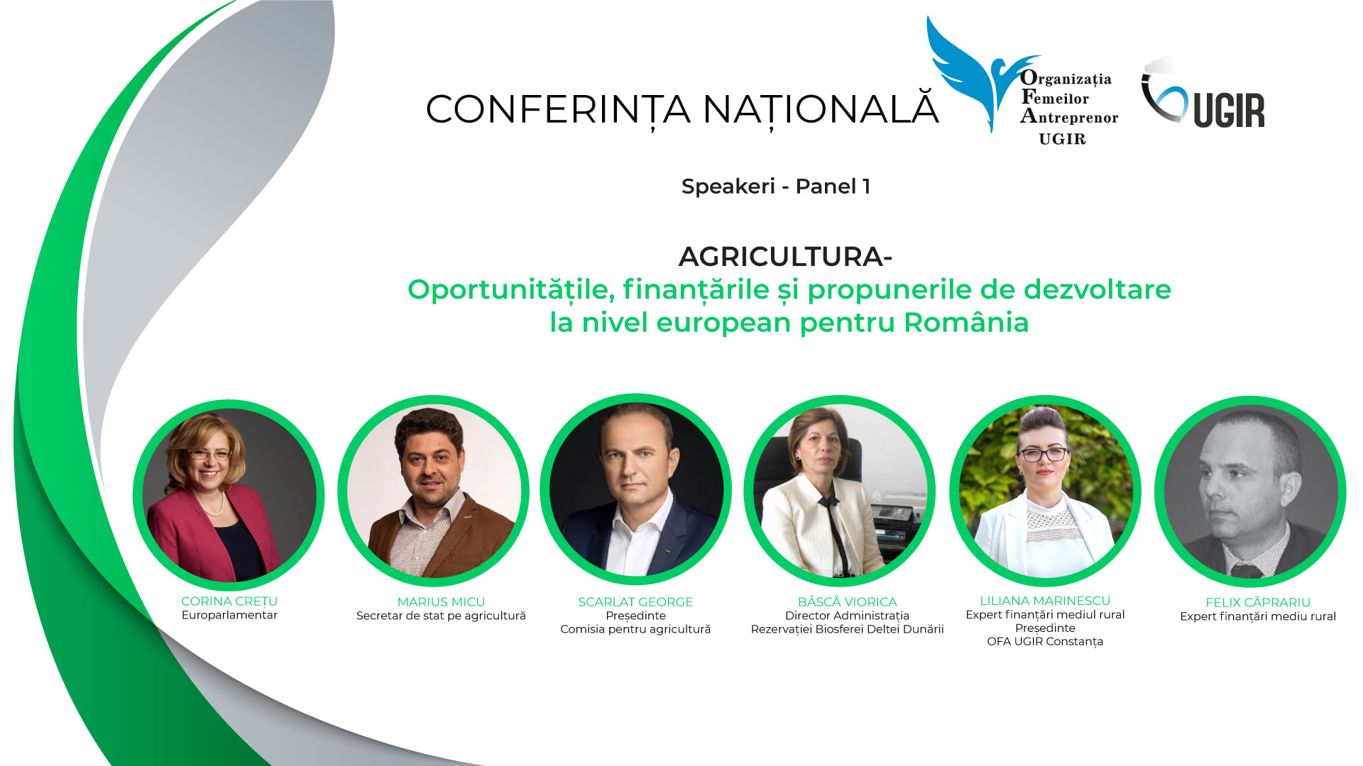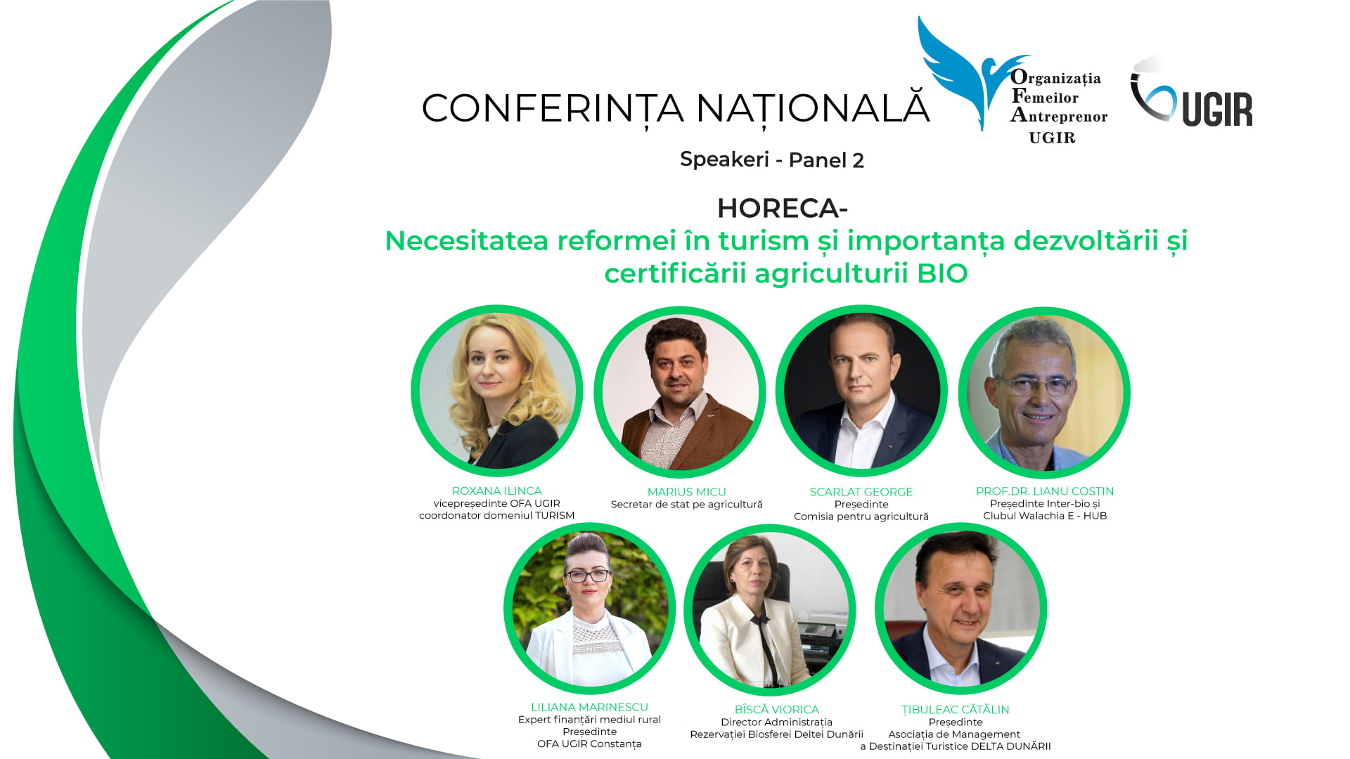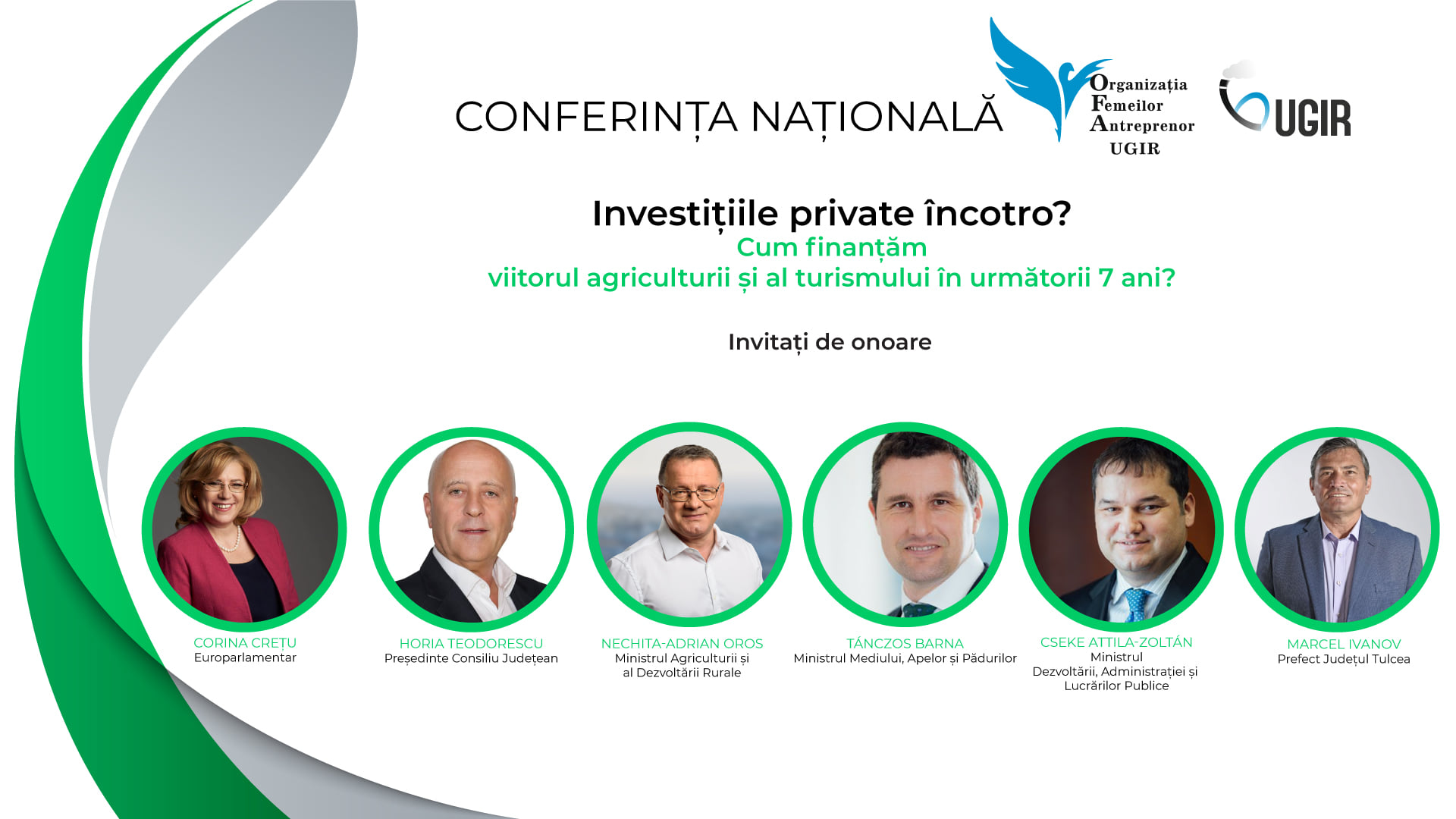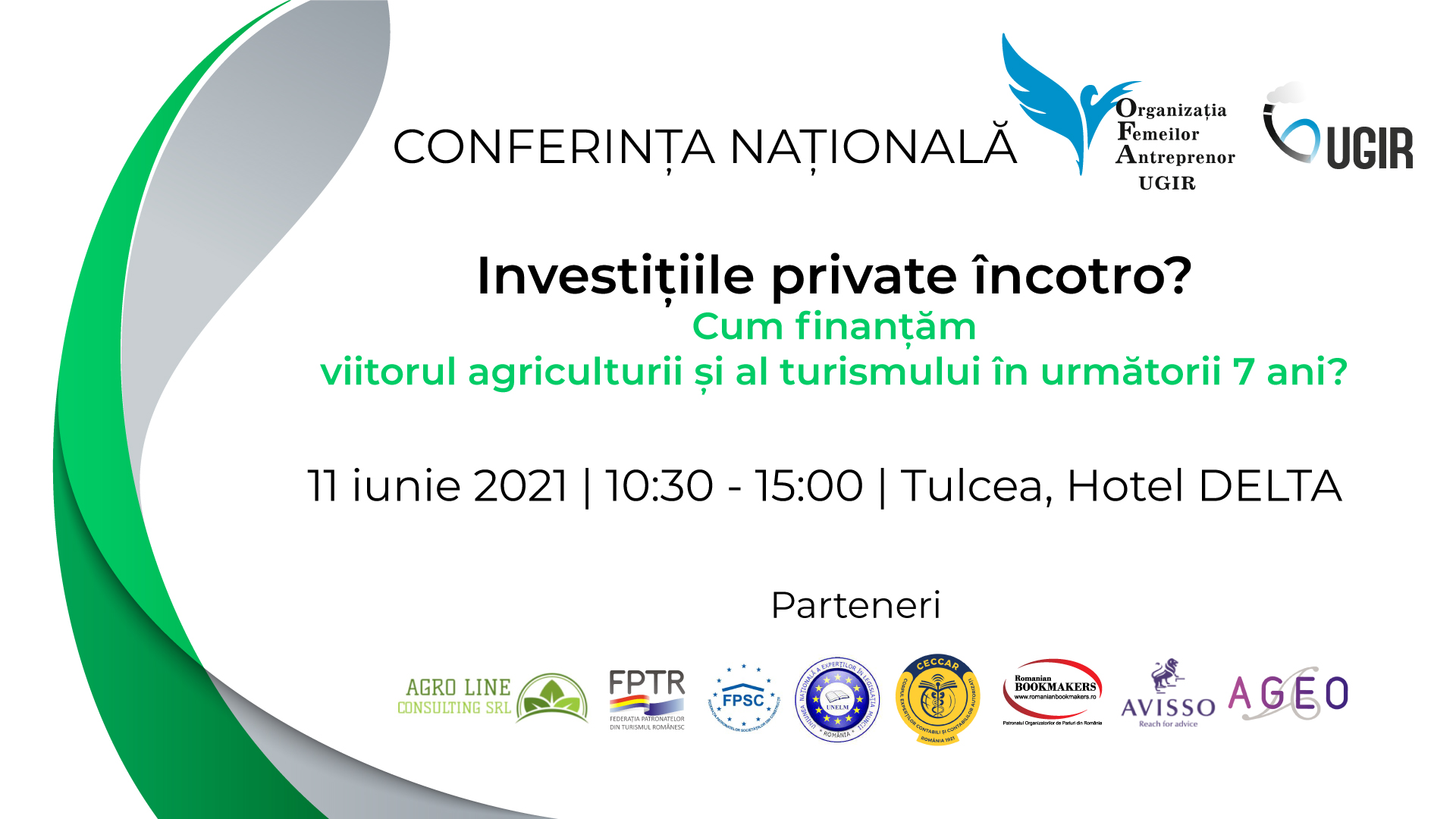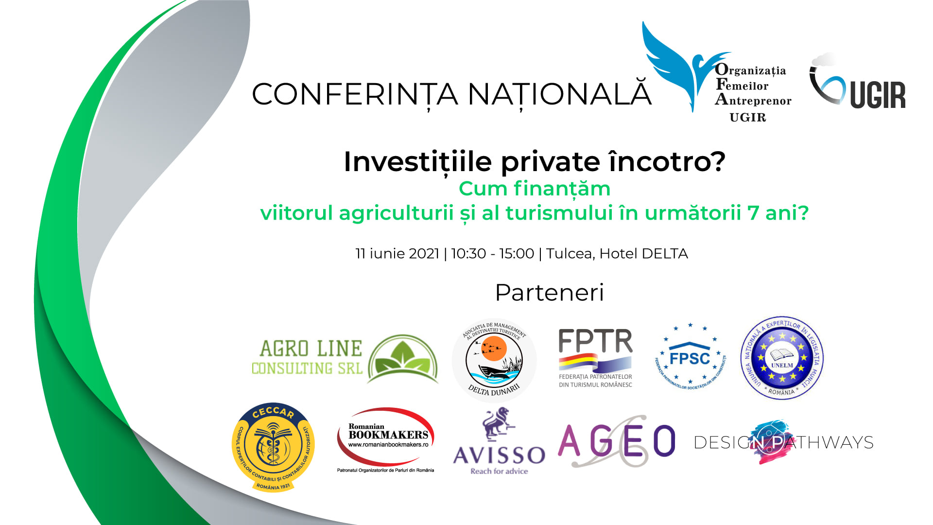 Organizația Femeilor Antreprenor din cadrul Uniunii Generale a Industriașilor din România (OFA UGIR), a organizat în data de 11 iunie 2021, la Hotel Delta din Tulcea, conferința națională Investițiile private încotro? Cum finanțăm viitorul agriculturii și al turismului în următorii 7 ani? Evenimentul a oferit ocazia unui dialog deschis între autorități și mediul de afaceri privat, pentru a găsi soluții și sprijin concret în salvarea și dezvoltarea afacerilor din domeniul privat agricol și cel al turismului.